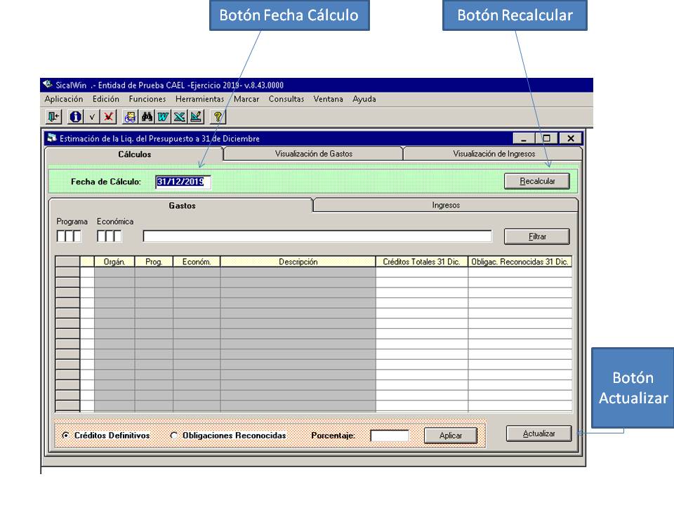 En este caso, acceder a Salidas por impresora/Estimación de la Liq. del presupuesto a 31 de diciembre. En "Fecha de cálculo" indicamos el 31/12/2019 y le damos al botón de "Recalcular".